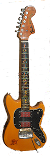 1966 Fender* Mustang Guitar w/ Rick Derringer series pick-ups by Dimarrzio*. This is a short scale guitar with all custom work. Just the neck and body are Fender*, the rest is pure upgrade. Traded a few record albums with my next door neighbor, Charlie Santora, for this neck and body, then painted half-assed purple.
